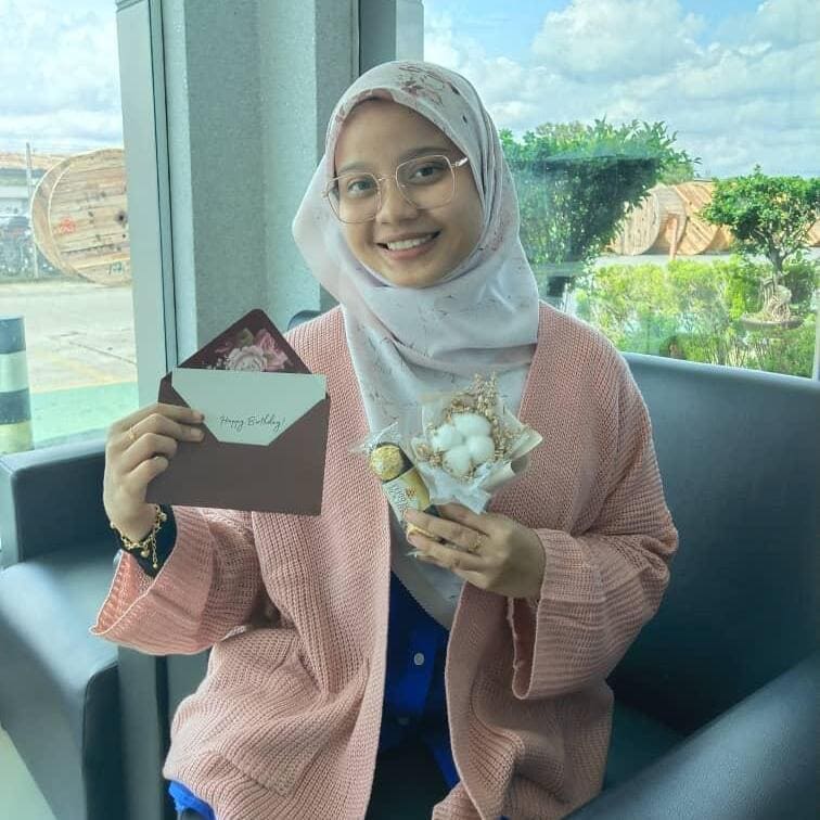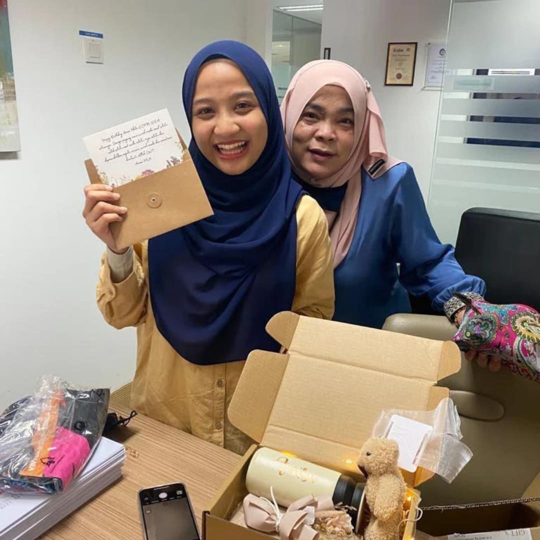 Si Dia tersenyum happy terima surprise custom gift box dari kami 😊